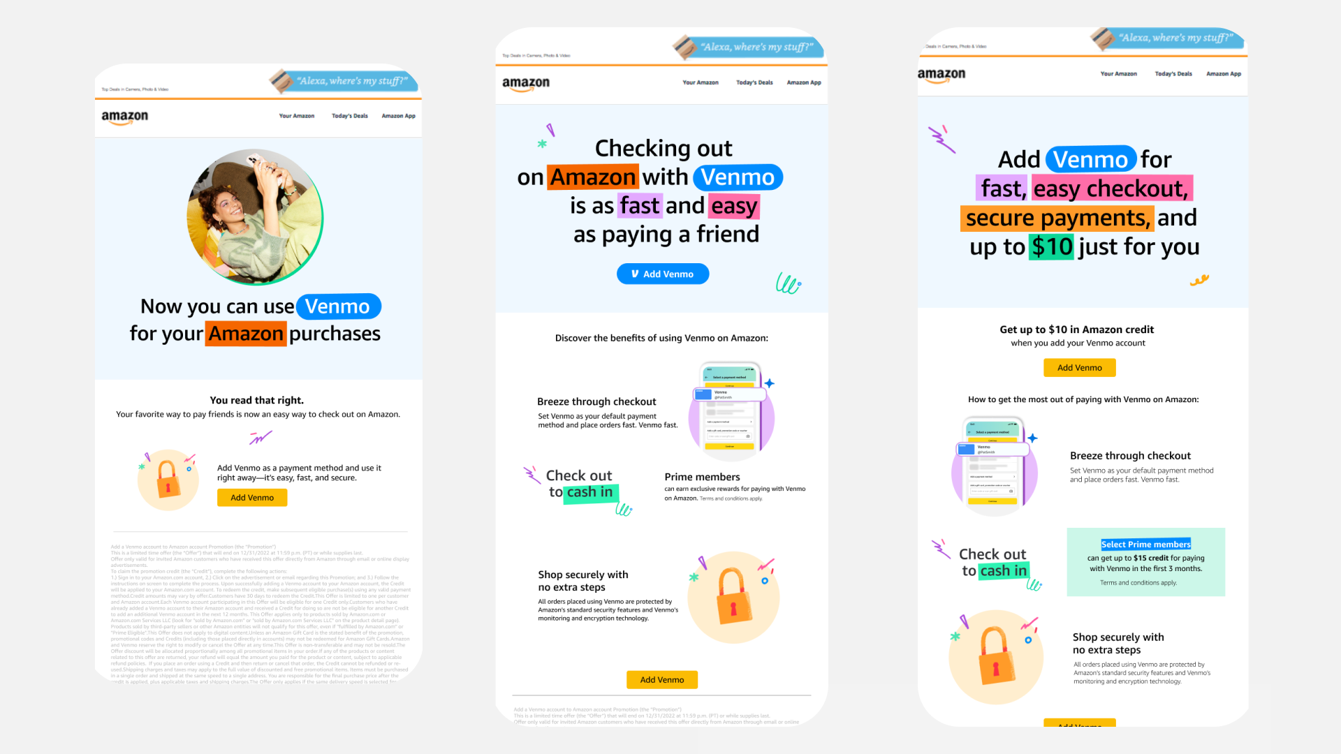 This insight shaped both the landing experience and the ad themes, helping Amazon position Venmo as not just another payment option, but a frictionless checkout method for digital-native shoppers.