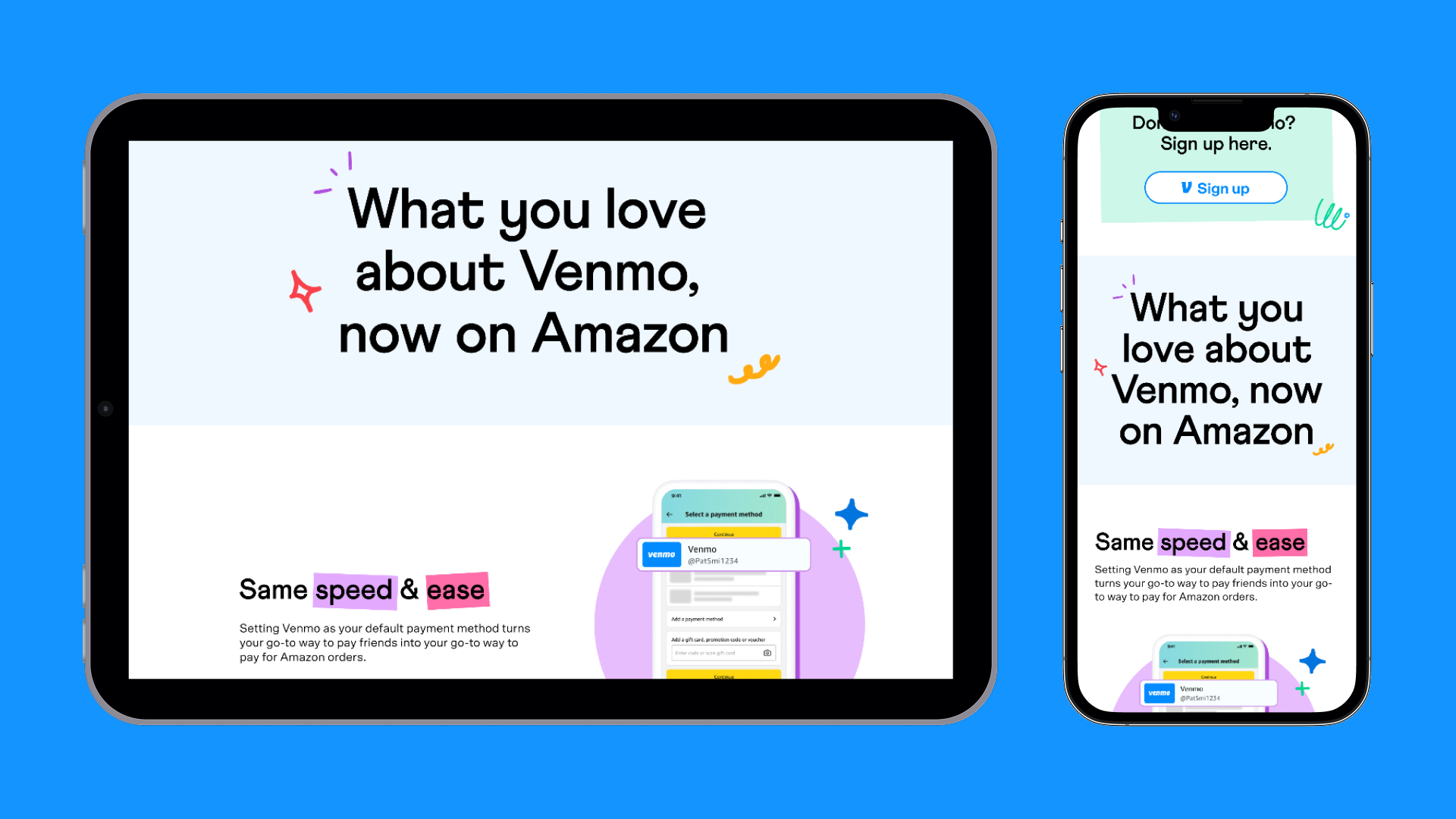 My role began with defining a cohesive visual direction that merged Amazon’s functional, scalable design system with Venmo’s vibrant personality. This included layout rules, visual hierarchy, iconography, illustration tone, and ADA-compliant color usage. I designed the core landing pages for mobile and desktop, ensuring the new experience felt seamless within the Amazon ecosystem while still being unmistakably Venmo.