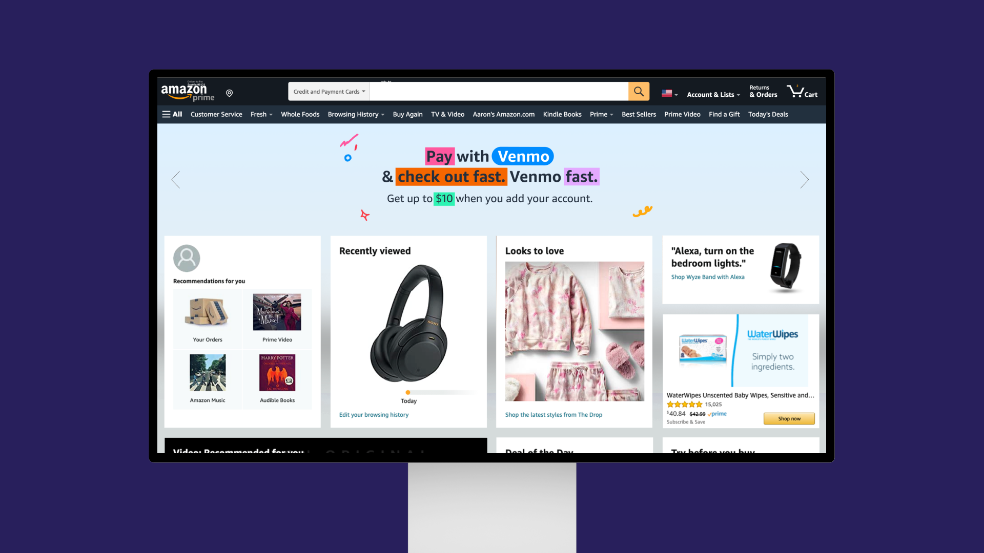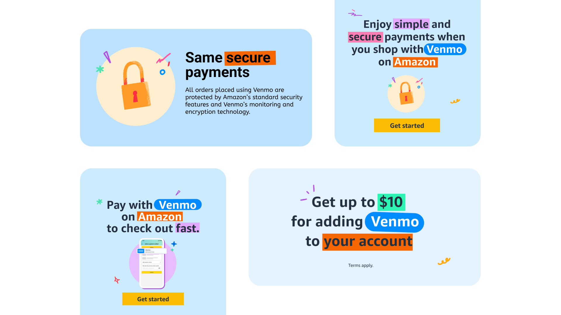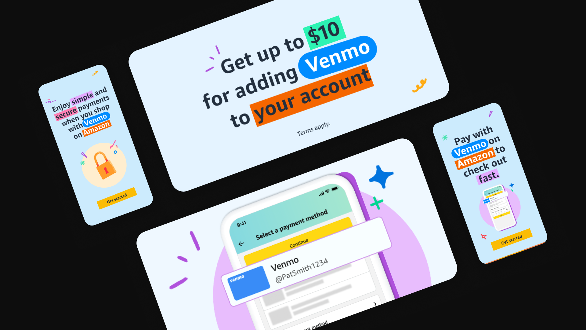 When Amazon partnered with Venmo to introduce a new payment option at checkout, the initiative required a full visual and UX rollout one that felt native to Amazon, respected Venmo’s playful brand personality, and clearly communicated the value of fast, easy, secure payments. As the Lead Visual Designer, I set the creative direction for the launch experience across Amazon.com and the Venmo ecosystem, ensuring consistency, accessibility, and brand trust.